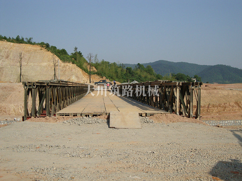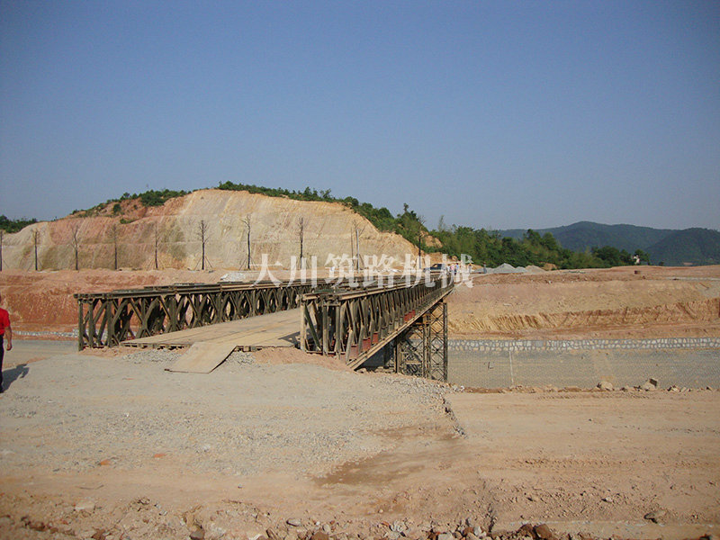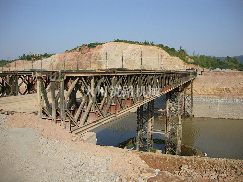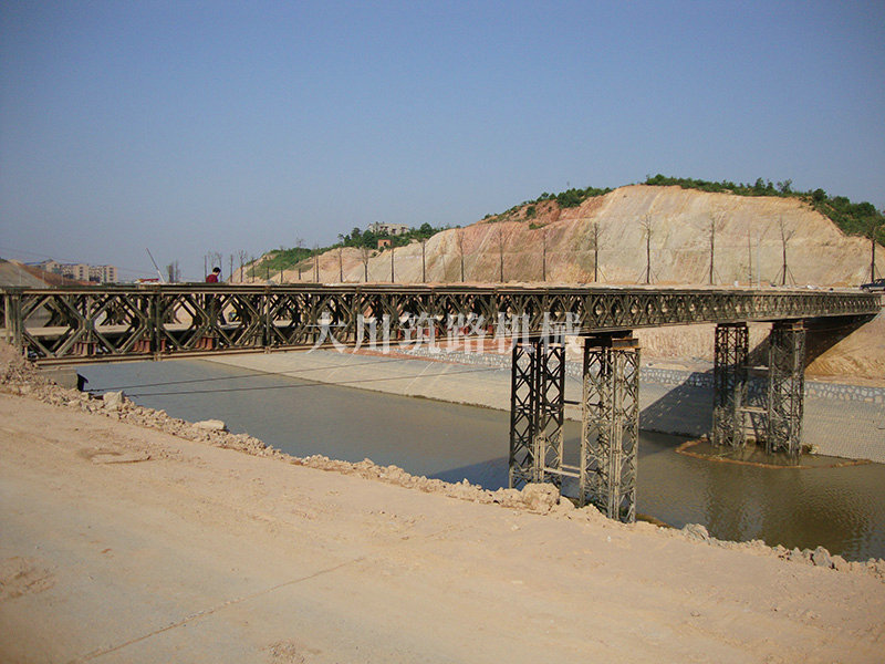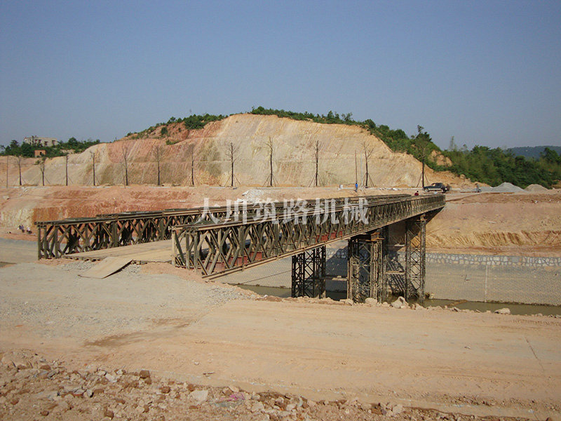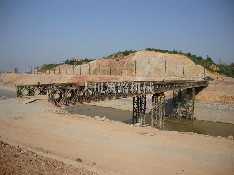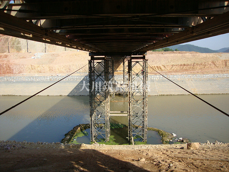 特點:本鋼橋由國防科技大學全程指導和監(jiān)督安裝,滿足荷載80T施工車輛通行,因施工場地要求,采用貝雷梁組合式橋墩,安裝拆除方便,穩(wěn)定性好。采用推出法安裝,安裝周期20天,于2011年5月25日通車。