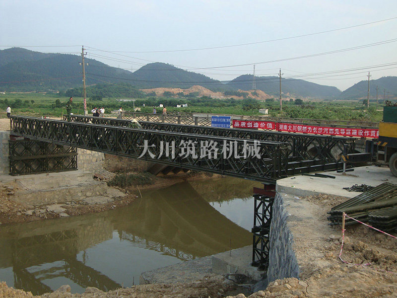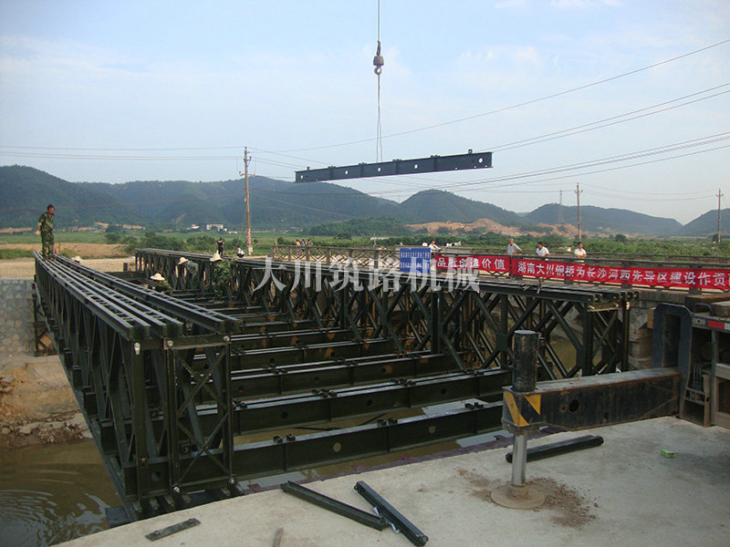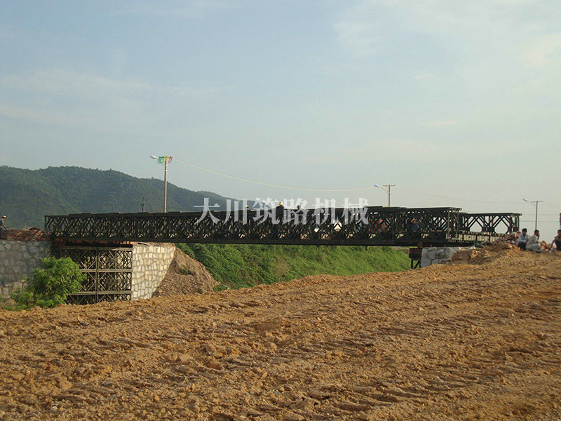 特點:本鋼橋由國防科技大學(xué)全程指導(dǎo)和監(jiān)督安裝,滿足荷載80T施工車輛通行,因施工場地要求,采用貝雷梁組合式橋墩,安裝拆除方便,穩(wěn)定性好。采用推出法安裝,安裝周期20天,于2011年5月25日通車。