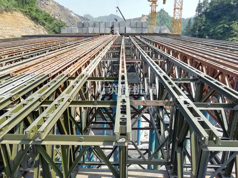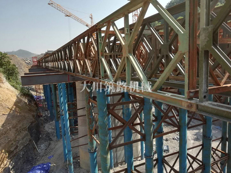 特點(diǎn):現(xiàn)澆梁支架平臺的跨度大,高度高,施工現(xiàn)場場所地非常有限,在局促的場地中和其他施工隊伍的場地需交叉作業(yè)。安裝過程中因拼好的主梁沒有平整的場地放置,需要在拼好的貝雷片上面拼裝對接;有些梁也因場地原因致使吊機(jī)沒有好的停車位,不能整根梁吊裝,采用半根梁吊裝在空中對接方式完成安裝,施工難度較大。