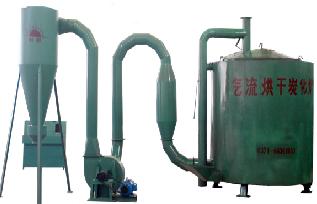 該機是一種邊炭化邊烘干的新型設備,在炭化的同時利用多于的熱源對所用物料進行烘干。充分利用能源,降低污染,提高效率。每4小時炭化一爐,連續生產不停機。